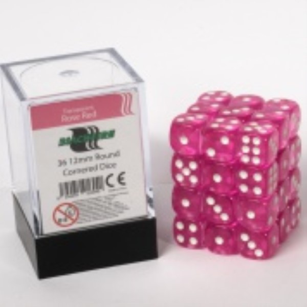 A set of 36 x 12mm round cornered dice (pipped D6) in an acrylic box.