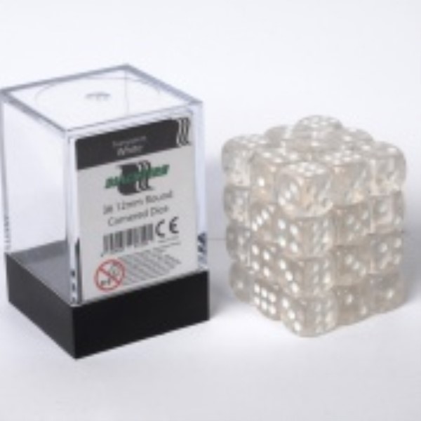 A set of 36 x 12mm round cornered dice (pipped D6) in an acrylic box.