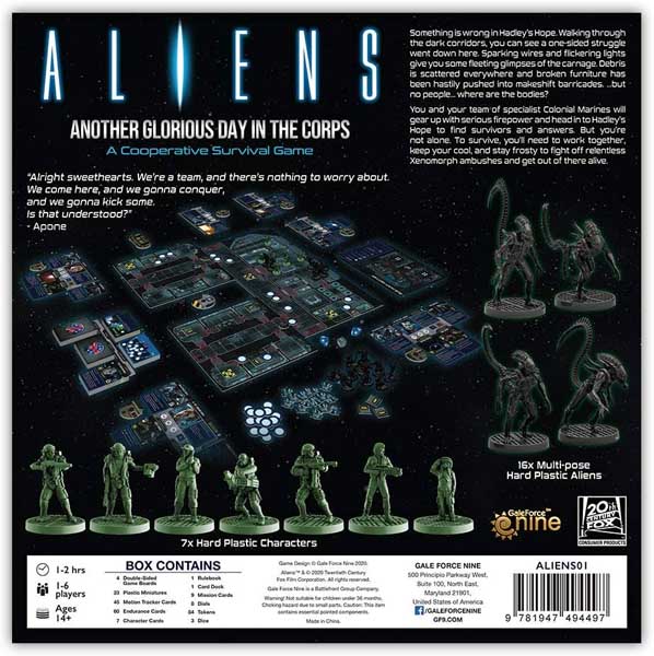 Aliens: Another Glorious Day in the Corps ! is a co‑operative survival board game in which you and your team of specialist Colonial Marines will gear up with serious firepower and head into Hadley’s Hope to find survivors and answers. But you’re not alone. To survive, you’ll need to work together, keep your cool, and stay frosty to fight off relentless Xenomorph ambushes and get out of there alive.
