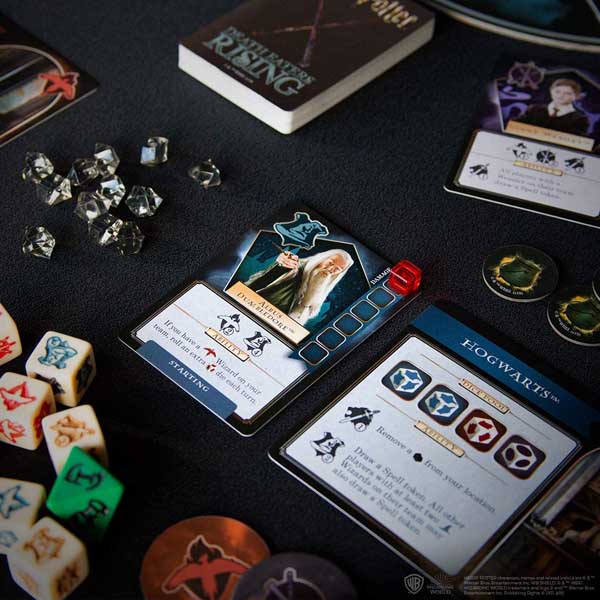 In Harry Potter Death Eaters Rising, each player must assemble teams of witches and wizards from the Order of the Phoenix, Dumbledore’s Army, and Hogwarts to fight against the growing threat of the Dark Lord. Starting with either Harry Potter or Hermione Granger representing Dumbledore’s Army, Minerva McGonagall or Albus Dumbledore from Hogwarts, or Nymphadora Tonks or Sirius Black from the Order of the Phoenix, players will be able to rally a variety of year-5 characters to their cause, such as Ginny Weasley, Luna Lovegood, Alastor Moody, Mrs. Norris, Severus Snape, and Rubeus Hagrid. The collective armies and players must then work together to stop the spread of dark influence throughout the wizarding world.