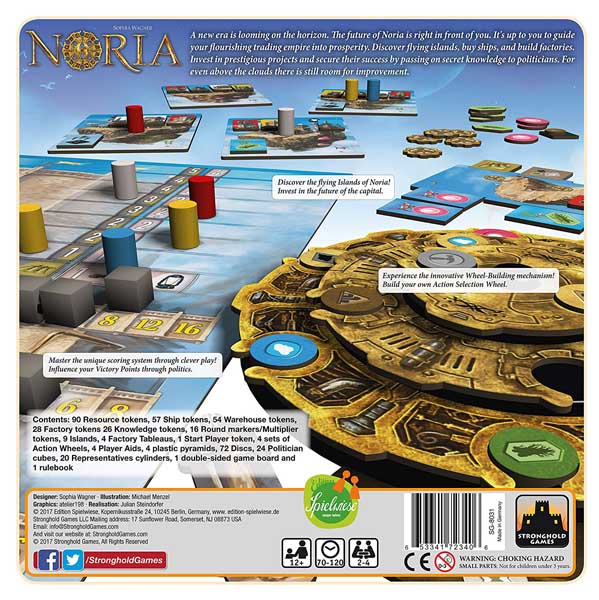 Noria is the debut title from Sophia Wagner, winner of the Spiel des Jahres fellowship in 2015. The talented, young author created an entirely new steampunk universe specifically for this game, and artists Michael Menzel and Klemens Franz have managed to bring her vision to life. At the center of the game is an innovative mechanism called “wheel building”. Each player has an action wheel consisting of three rings, with slots for a number of different action discs. Over the course of the game, players try to obtain new discs and manipulate the rings of the wheel to optimize their action selection. Additionally, to ensure their investments bear fruit, they also need to bribe politicians with knowledge.