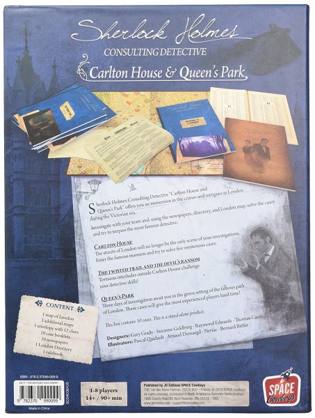 Return to the streets of Victorian London, but also venture into brand new locations in the latest installment in the Sherlock Holmes Consulting Detective line: Carlton House & Queen’s Park! Like the previously released The Thames Murders and Other Cases, Carlton House & Queen’s Park introduces ten exciting cases, each one drawing players deep into the world of Sherlock Holmes. Among these cases includes two classic, long out-of-print expansions which are now revised and updated. Whether you’re playing solo or with up to eight possible players, you need your wits about you to solve the cases and beat Holmes himself!