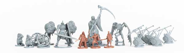 - 18 Miniatures (1 large boss, 3 characters, 1 mini boss, 13 enemy minis), 4 Double-sided Game Tiles, 3 Character Boards, 3 Token Boards, 1 Campaign Dashboard, 1 Rulebook, 15 Dice, 169 Cards, and 2 Health Dials