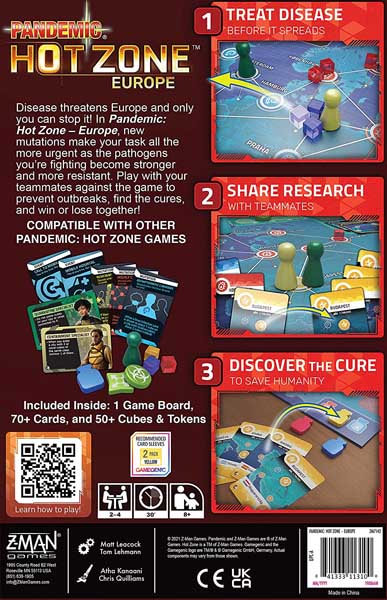 Based on the bestselling Pandemic, the Pandemic: Hot Zone series continues to emphasize that teamwork and cooperation are paramount to success, but in a smaller form with a quicker playtime that you can take anywhere. Pandemic Hot Zone Europe takes it even further with its cross compatibility with other Hot Zone titles to create an even larger, more challenging game.
