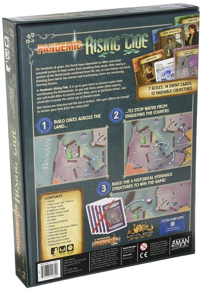 In Pandemic: Rising Tide, you and your friends play as a team of Dutch civil officials helping to modernize the water containment system. Your ultimate goal is to construct four hydraulic structures that will ensure the safety of the Dutch people for generations to come. To accomplish this task, however, you must first buy yourself enough time by building dikes to control water flow, ports to facilitate travel, and windmills to pump the water out of flooded lands. But proceed with caution.