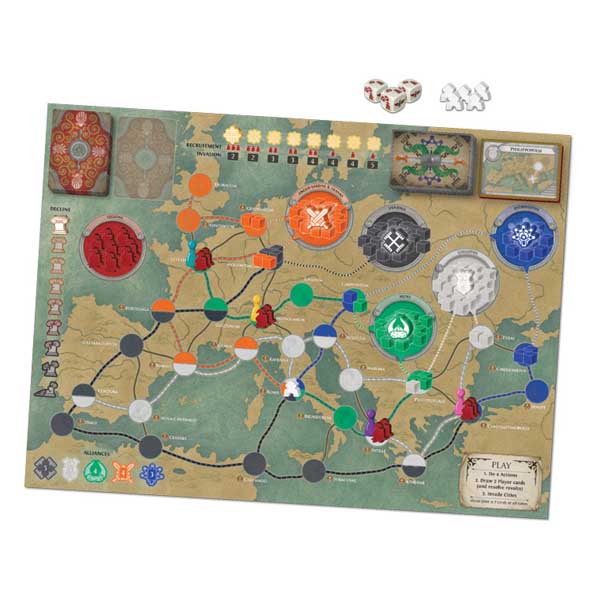 Combining the cooperative gameplay of Pandemic with innovative new mechanisms, Pandemic: Fall of Rome takes players back in history to the time of the world’s greatest empire: Rome. A weakened military has left the borders open to invasion from countless tribes such as the Anglo-Saxons, Goths, Vandals, and Huns. As you march through the Roman Empire, you must recruit armies, fortify cities, forge alliances, and face off against the invading hordes in battle.