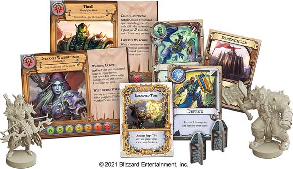 You and your friends will team up as legendary heroes from across Azeroth, each with their own unique abilities to help in and out of combat. Heroes such as Thrall, Warchief of the Horde; Varian Wrynn, King of Stormwind; Sylvanas Windrunner, Banshee Queen of the Forsaken; and many more are at your fingertips. As the Scourge grows, more undead will populate the board. Throw dice as you enter into battle against the hordes of ghouls and ferocious abominations, using hero cards to add power to your attacks, block incoming assaults, heal wounds, take mounts to far off spaces, and so much more.