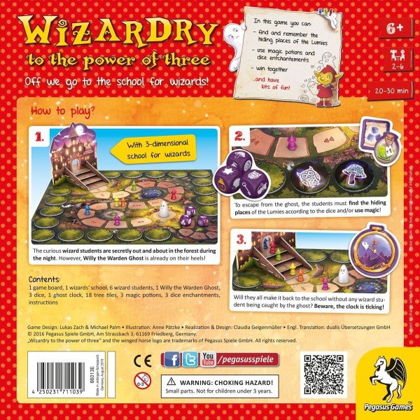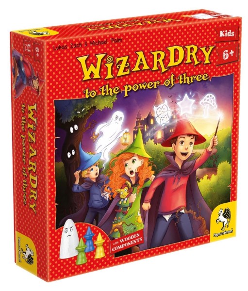 Wizardry to the power of three by Michael Palm and Lukas Zach is a cooperative board game for 2 to 6 wizard students ages 6 and up. While escaping the Warden Ghost, players need to work together, memorize the tree tiles and use their magic potions and dice enchantments at the right time to make it back without being caught and win as a team.