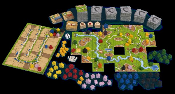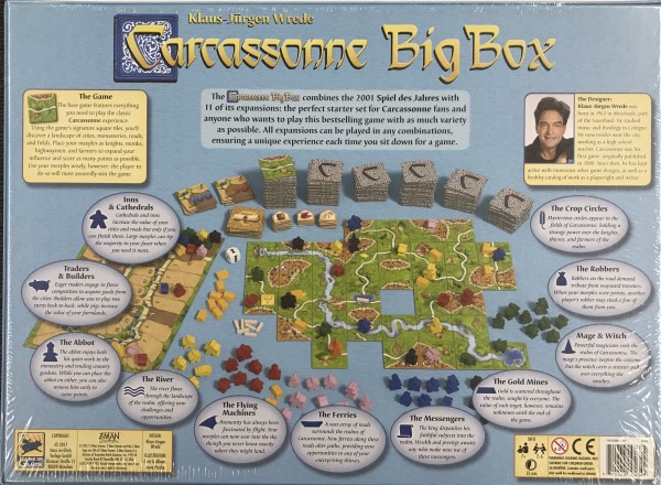 The 2017 edition of the Carcassonne Big Box contains the Carcassonne base game, the Inns & Cathedrals and Traders & Builders expansions, the mini-expansions The River and The Abbot now included with the base game, and the six mini-expansions from 2012: The Flying Machines, The Messengers, The Ferries, The Gold Mines, Mage & Witch, and The Robbers (which collectively include the tiles for the Corn Circles II mini-expansion).