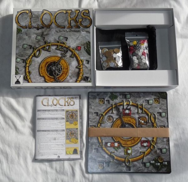 Each player chooses a clock and receives a number of coins. The start player rolls a number of dice equal to the number of players plus one, then divides them into groups. All players make a simultaneous blind bid on the dice lots, with the highest bid choosing first, and so on. Each player puts the purchased die/dice on his clock in a clockwise direction, gaining money, bonus actions, or both in the process. On each turn, a player may execute one free action, in addition to buying one more action.