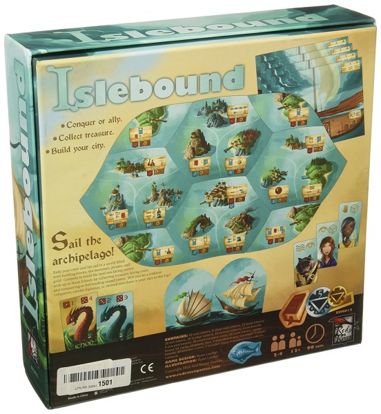 In Islebound, you take command of a ship and crew. You sail to island towns, collecting resources, hiring crew, and commissioning buildings for your capital city. Each building has a unique ability, and your combination of buildings can greatly enhance your strength as a trader, builder, or invader. You also recruit pirates and sea monsters to conquer towns, which, once conquered, allow you to complete the town action for free, and charge a fee to opponents if they want to use it. Alternatively, you can complete events that give influence, which can be used to befriend towns.