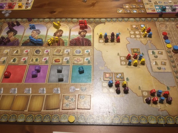 The dice mechanism is easy and innovative and gives players a simple, but challenging choice. Money is always tight, so there is a temptation to choose a high valued dice, but that needs to be balanced with obtaining the reward.