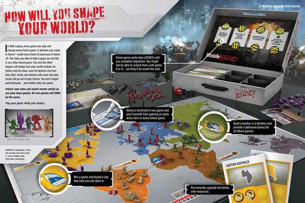 In Risk Legacy, every game you play will change every future game. A decision you make in Game 1 could come back to haunt you in Game 10.