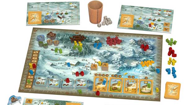 Contents: 128 Premium Wooden Pieces, 120 Detailed Tiles, 40 Illustrated Cards, 7 Dice, 4 Player Boards, 1 Leather Dice Cup, 1 Game Board, 1 Rulebook, 1 Summary Sheet