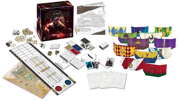 The King’s Dilemma is an interactive narrative experience with legacy elements, featuring several branching storylines leading to many possible finales and an evolving deck of event cards at its core. Players represent the various houses leading the government of the Kingdom of Ankist.