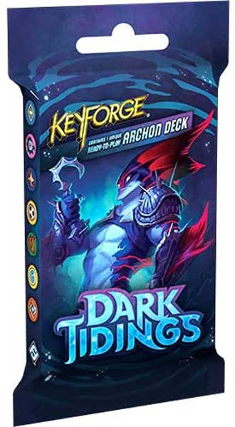 Dive beneath the waves of the Crucible’s oceans with Dark Tidings, the fifth set of Archon Decks for KeyForge, the world’s only Unique Deck Game! Dark Tidings introduces a brand-new House to the game: the Unfathomable. Replacing Dis in the current cardpool, the Unfathomable specialize in controlling their opponents by exhausting enemy creatures. What’s more, every House gains the power to call upon the tides of the Crucible, gaining advantages from high tide and avoiding the punishments of low tide. Finally, Dark Tidings also brings the possibility of evil twin decks into the game! Any evil twin deck is an exact copy of another deck in existence, except with many of its cards exchanged for their “evil twin” versions, featuring alternate abilities, graphic design, and art.