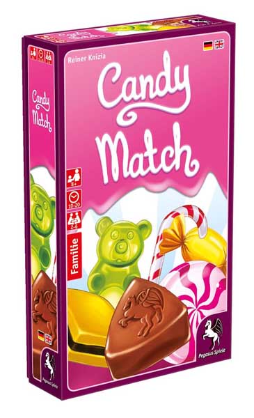 In Candy Match, players place cards depicting one to three sweets. As soon as a player finds a card combination in which all the candy depicted is in pairs, they call “Candy match” and show their solution. If the symbol pairs are correct, the player receives all the cards involved in the matches; if they’re wrong, each other player takes one card from the center of the table. Once the draw pile is exhausted and no more combinations can be found, the game ends and the player with the most points wins.