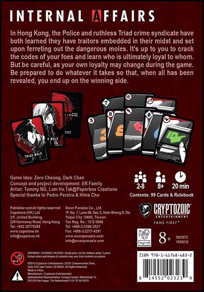 In Hong Kong, the Police and ruthless Triad crime syndicate have both learned they have traitors embedded in their midst and are determined to ferret out these dangerous moles. It’s up to you to crack the codes of your foes and learn who is ultimately loyal to whom. But be careful, as your own loyalty may change during the game. Be prepared to do whatever it takes so that when all has been revealed, you end up on the winning side.