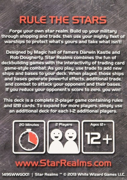 Star Realms is a spaceship combat deckbuilding game designed by Magic Pro Tour Champions and Hall of Famers Darwin Kastle and Rob Dougherty (developer and cofounder of the Ascension Deckbuilding Game). The game offers all the thrills of traditional trading card game style combat, combined with the fun of a deckbuilding game. Play powerful ships, destroy enemy bases or blast your opponent directly on your way to victory!