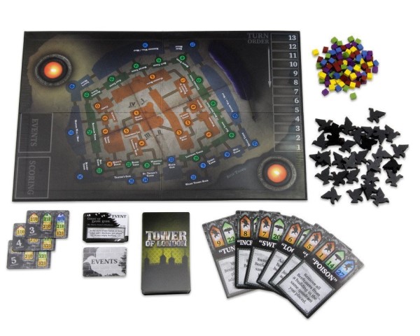 In Tower of London, players fight for control of the tower using their influence to occupy different buildings and gather ravens. Each turn players play two cards: the first card determines which building their Beefeater (guard) goes into, and the second card has a special power that triggers from the perspective of the Beefeater just placed.
