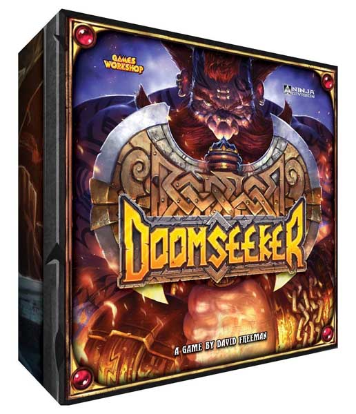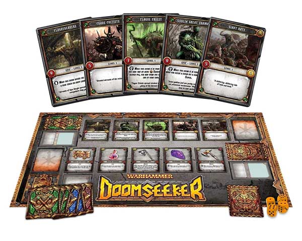 In Doomseeker, 2-4 players assume the role of Slayers to battle the monsters of the Old World and find a worthy death. Players will slay many foes, hoard gold, and purchase deadly new weapons. If lucky, players will find their deaths at the hands of an epic and terrible foe. During the quest, Slayers earn renown through slaying dooms and satisfying grudges. During rounds, each player takes a turn. The active player draws a Fate Card. Those cards normally change or reference the fight that is about to happen in some way. Then each other player will be able to play a fate card that could impact the upcoming battle for the active player. Once all players have done so, the active player plays a final Fate Card and then faces their chosen Doom. If the Doom is defeated by a combination of a dice roll and the Slayer’s strength being higher than the strength of the Doom, then the active player adds that doom to their scored pile as well as the gold value listed for the Doom. Once all players in the game have had their chance to face a Doom, then a new round begins.