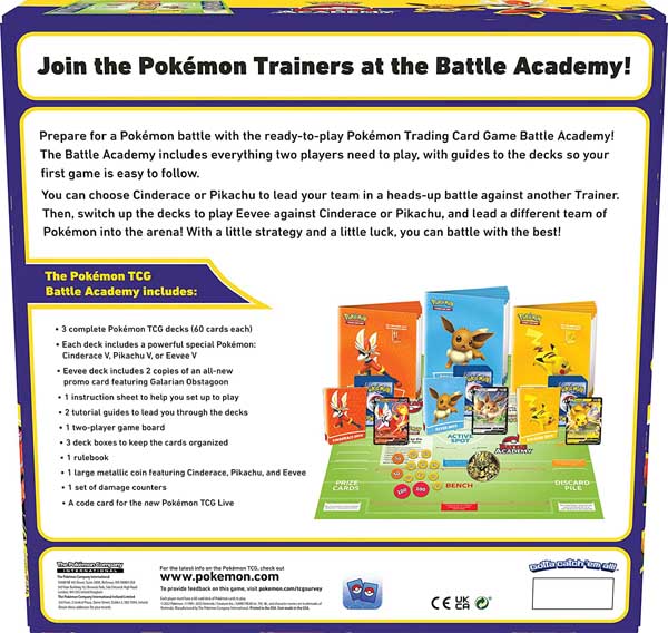 Prepare for a Pokémon battle with the ready-to-play Pokémon Trading Card Game Battle Academy! The Battle Academy includes everything two players need to play, with guides to the decks so your first game is easy to follow. You can choose Cinderace or Pikachu to lead your team in a heads-up battle against another Trainer. Then, switch up the decks to play Eevee against Cinderace or Pikachu, and lead a different team of Pokémon into the arena! With a little strategy and a little luck, you can battle with the best!