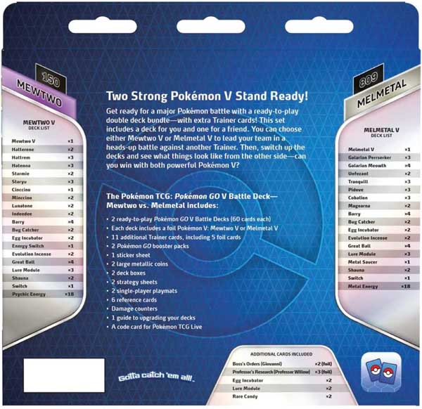 The Pokémon TCG: Pokémon GO V Battle Deck—Mewtwo vs. Melmetal includes: