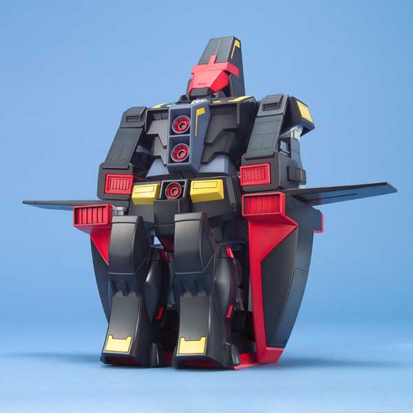 Though it’s spelled ‘Psycho’ and brings to mind lonely motels and a preternatural love of mother, the name of this Gundam refers to the “PSYchic COmmunications” system that allows the pilot to “think” reports back to home base. The box is huge; though the scale is 1/144 the box is easily as big as that of a Master Grade kit! But all those parts (about 218, plus polycaps), are necessary — the completed model folds down into Mobile Armour! Molded all in colour; features snap-fit assembly, and stickers for details.