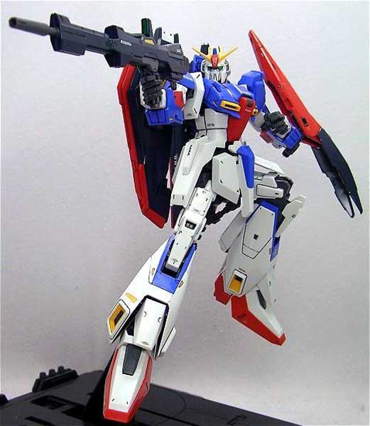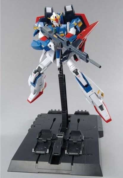 Big beautiful version 2.0 Master Grade Zeta Gundam comes with a bazillion parts (yes, I’m too lazy to count them. 17 ABS runners, one base, plus polycaps) and goes together in the new fashion, with the super new joints at the waist and in the arms and legs, allowing it even more freedom of movement and incredible posing than ever before! It’s fully-transformable when completed, too. What more could you ask for? (well, a life-sized version would be nice, but you’d get tired just lifting the polycaps, trust me). Shield and beam mega launcher weapons (as well as the regular rifle, beam sabres, etc.) are included, and a custom catapult stand is included to hold it all up — with all the extra armour and weaponry, it’ll be a little heavy when completed! Two unpainted pilots and an unpainted miscellaneous crew member are included. All parts snap together and are molded in colour so paint and glue for the kit are not necessary; foil stickers and clear Gundam stickers are included for detail. However, if you’d like to paint it, it would look pretty spiffalicious, and a paint scheme is provided (paint is of course sold separately).