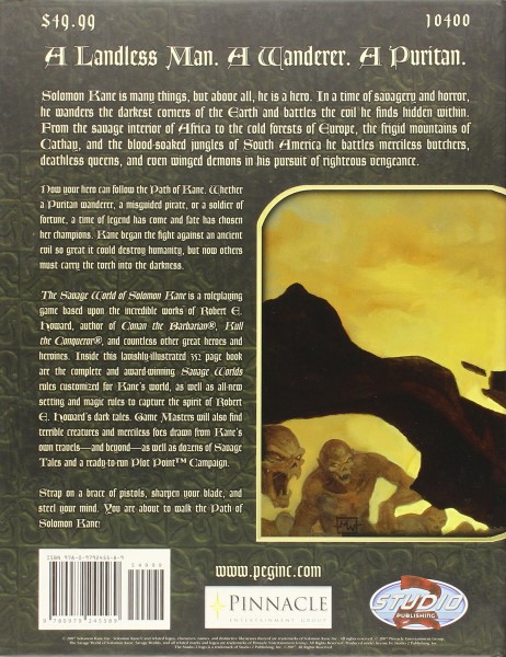 The Savage World of Solomon Kane is a roleplaying game based upon the incredible works of Robert E. Howard, author of Conan the Barbarian®, Kull the Conqueror®, and countless other great heroes and heroines. Inside this lavishly-illustrated 352 page, full-color hardcover book are the complete and award-winning Savage Worlds rules customized for Kane’s world, as well as all-new setting and magic rules to capture the spirit of Robert E. Howard’s dark tales. Game Masters will also find terrible creatures and merciless foes drawn from Kane’s own travels—and beyond—as well as dozens of Savage Tales and a ready-to-run Plot Point™ Campaign.