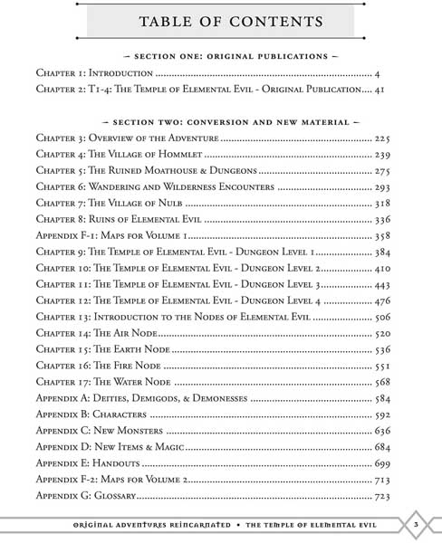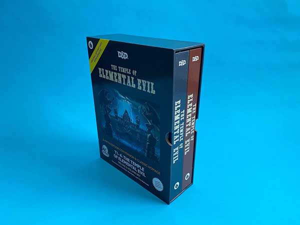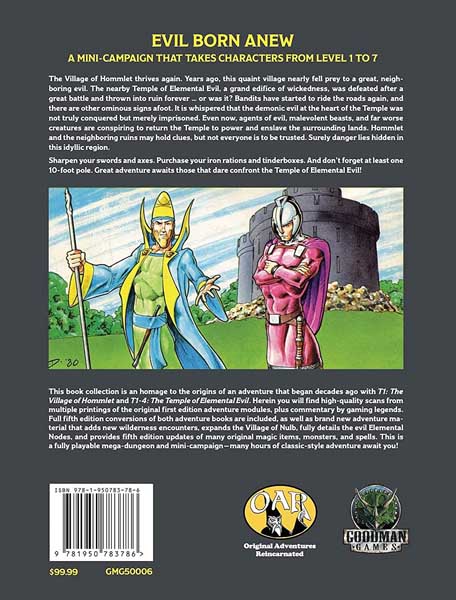 This book collection is an homage to the origins of an adventure that began decades ago with T1: The Village of Hommlet and T1-4: The Temple of Elemental Evil. Herein you will find high-quality scans from multiple printings of the original first edition adventure modules, plus commentary by gaming legends. Full fifth edition conversions of both adventure books are included, as well as brand new adventure material that adds new wilderness encounters, expands the Village of Nulb, fully details the evil Elemental Nodes, and provides fifth edition updates of many original magic items, monsters, and spells.