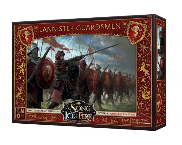 The A Song of Ice and Fire: Tabletop Miniatures Game Lannister Guardsmen unit box comes with 12 Lannister Guardsmen figures, one Guard Captain Unit Attachment, a Movement Tray, and all associated Unit cards. These soldiers are not the fastest, or even the strongest, in the war. What they do have is an incredible level of defense, giving them the ability to wear their opponents down. Wars are won by those with the will to continue fighting.