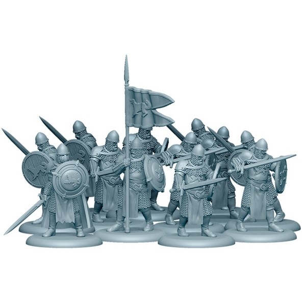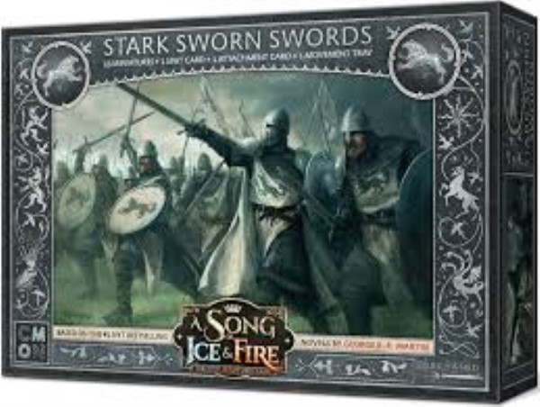 The A Song of Ice and Fire: Tabletop Miniatures Game Stark Sworn Swords unit box contains 12 miniature Sworn Sword figures, one Sworn Sword Captain figure, one Sworn Sword Unit Attachment, a Movement Tray, and all associated Unit cards. These warriors have waited in the frozen North too long, dreaming of battle. They may not be the best equipped units in the war, but they know that shiny armor and pretty swords alone do not a soldier make.