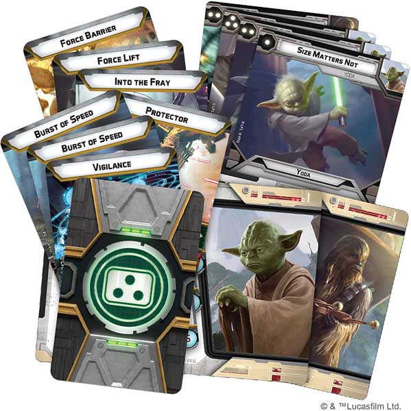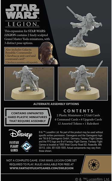 This expansion adds this legendary Jedi to your Star Wars: Legion collection, beginning with two beautifully detailed, unpainted Grand Master Yoda miniatures that can be assembled in a variety of poses, such as leaping into battle or concentrating while reaching out with the Force. All of Yoda’s skills, including his deep connection to the Force, are laid out on a unit card and his three signature command cards. These substantial powers can be further augmented by eight upgrade cards that grant him new Force powers and ways to command your armies. Finally, this expansion also includes a Republic unit card and an additional command card for the mighty Wookiee Chewbacca, allowing you to use your existing miniature in this faction.”