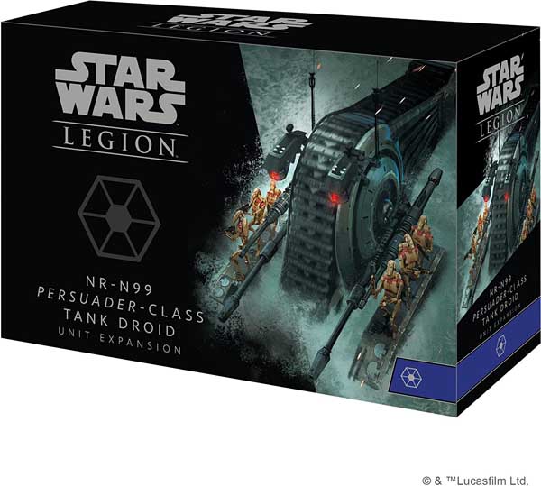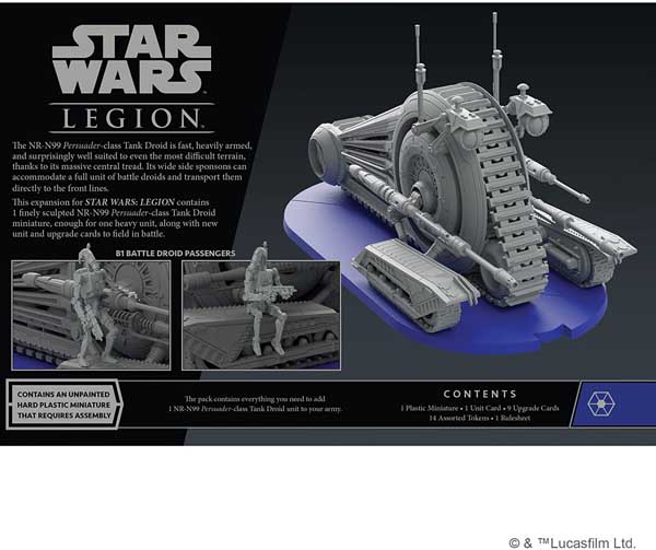 Lead the assault with the NR-N99 Persuader-class Tank Droid Unit Expansion for Star Wars: Legion! This fast, heavily armed tank droid is surprisingly well suited to even the most difficult terrain thanks to its massive central tread. Its wide side sponsons can accommodate a full unit of battle droids and transport them directly to the front lines.
